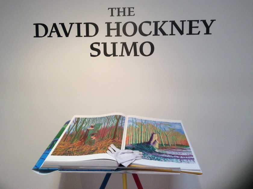 Day 19 and after a morning’s work I’m restless. I’ve been sitting editing with the dogs in the garden but it’s cold. So I go to a nearby David Hockney retrospective. Hockney is 79. He is from Yorkshire, near Bradford, and has spent many years painting and working in Los Angeles. He’s a legend. He has recently released a new book, Sumo, a journey through the bulk of his art, retailing at $2500. Taschen, the publisher, has some copies on display not far from where I am. And the man is in the news tomorrow so it seems like the perfect time to celebrate his works.