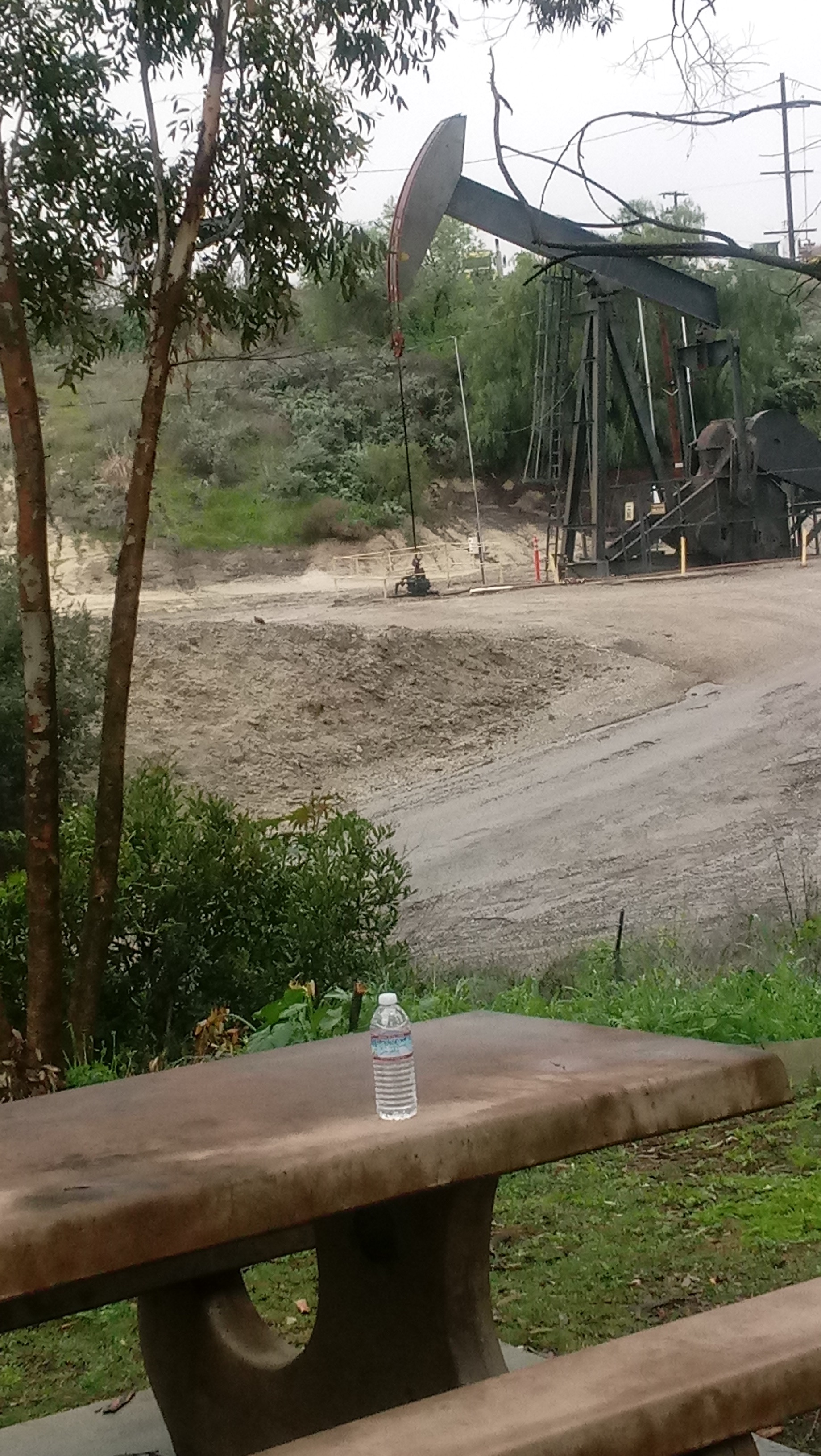 It seems to be the thing to do here at Baldwin Hills. People at all stages of fitness are using them as a free gym, even on a crappy rainy day like this. And they’re talking and laughing and out in the cold improving themselves just because. The stairs feel happy, and the derrics feel oppressive. Do things take on the character of their use?