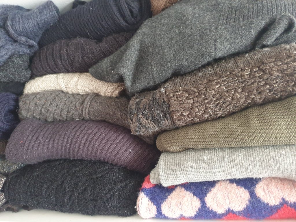 We fixed the shelves. Then we put all the items back. I stopped counting jumpers when we hit 100. There’s enough for a different jumper for her to wear every day of the winter. We shook and folded the lot because the moths are breeding somewhere and they are as unwelcome as they are hard to get rid of. We put them back with a strict system, which is a largely alien process for me with shelves. Now she knows how to get all her cashmere. She’s still gonna wear just the same two of them. Just like I’ll never read most of my books.
