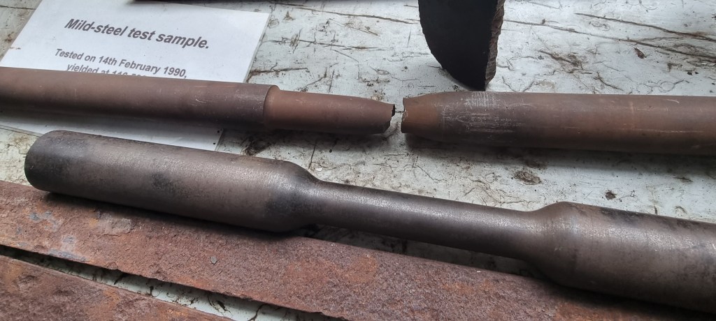 In Southwark, housed in a prime location just south of Blackfriars Bridge, there is a listed building. It contains obsolete machines. Their purpose was to test things to destruction. In that picture, there are two steel rods. They were pulled in one of the machines. The bottom one stretched but didn’t snap, even under tremendous pressure. The top one snapped.