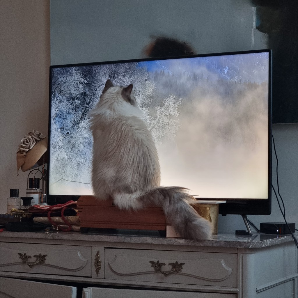 The two incredible cats I’ve been spending time with are as different as cats can ever be. The male is dumb as a post and desires attention and love without complication. The female is a tragic heroine. She has a heart condition. She must be kept in careful peace, but she likes taking a swipe at things. She had us wrapped around her finger. We only watched David Attenborough because we (correctly) thought she’d like it. She bounced up to the screen when the tiger appeared, and spent most of the programme trying to swat birds.