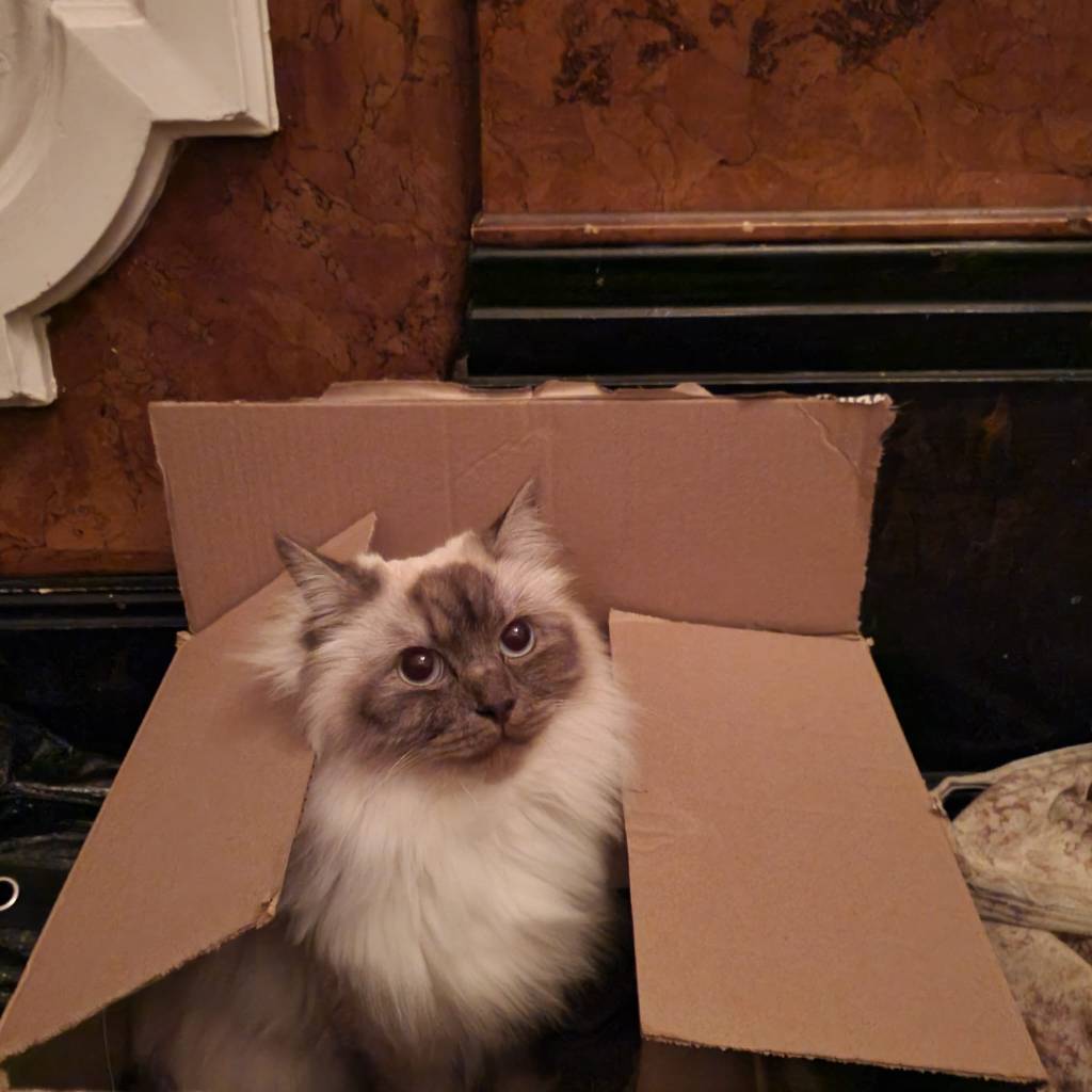 Post bath, I did another mission, to the cat palace. This is where I am now. From doggie to pussies. One of them is wandering around on top of me trying to establish the best place to be stroked. The other one is in a box. Special delivery.