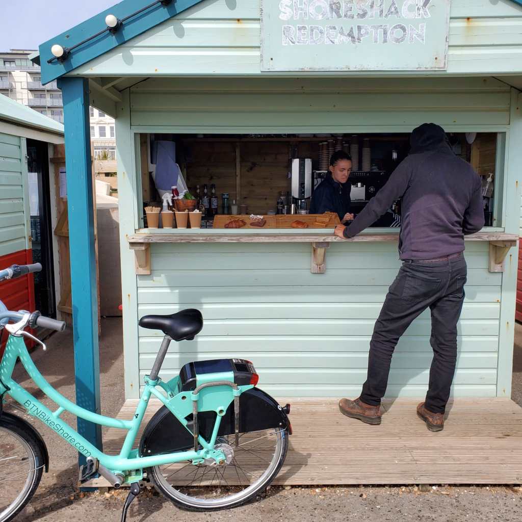 The last time I got one of those Brighton bicycles it was so memorably terrible that it scarred me slightly, so it was with a degree of trepidation that I selected and unlocked one of only two bikes that were left at the rack. The basket was full of empty cans of gin and crisp packets, but apart from the handles and brakes being sticky in different ways there was nothing else wrong with it. Functional heavy bike. We went to Hove and beyond with the wind behind us.