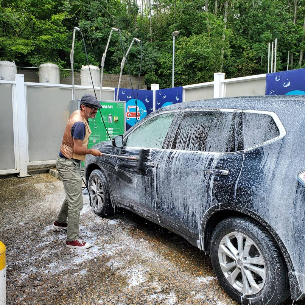 I’m not in a bikini. I’m in a sodding waistcoat and converse. There’s a self service jetwash. It’s only a couple of quid. You spray your car with stuff that has been sitting for weeks and smells of feet. Your car gets shinier. You get the seagull poo off. You drive away wondering why everything smells faintly of feet. It is cheaper than a car wash.