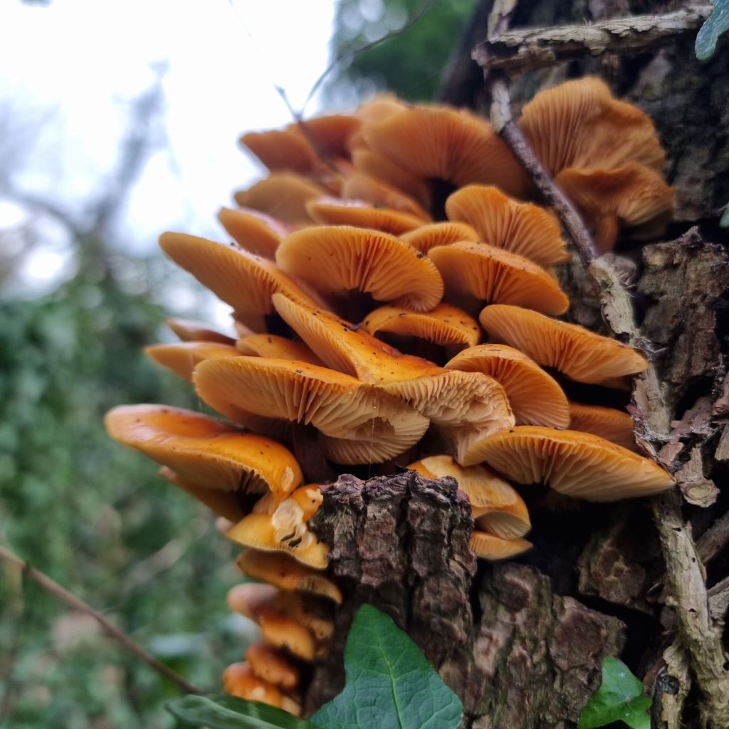 We go there pretty often, to Stanmer. There’s good walking, ancient cedars, and some decent shroom activity there. Even today, in the off-season, we found some excellent ones. Velvet Shanks, which peak in January, usually on dead beech. A flourish of them. Enoki. There was enough there and in good enough condition for an excellent soup. But it is my first positive and I’m only allowed to eat them when I’ve had three clear positives backed up by second opinions. So I left them. We had plans for dinner anyway.