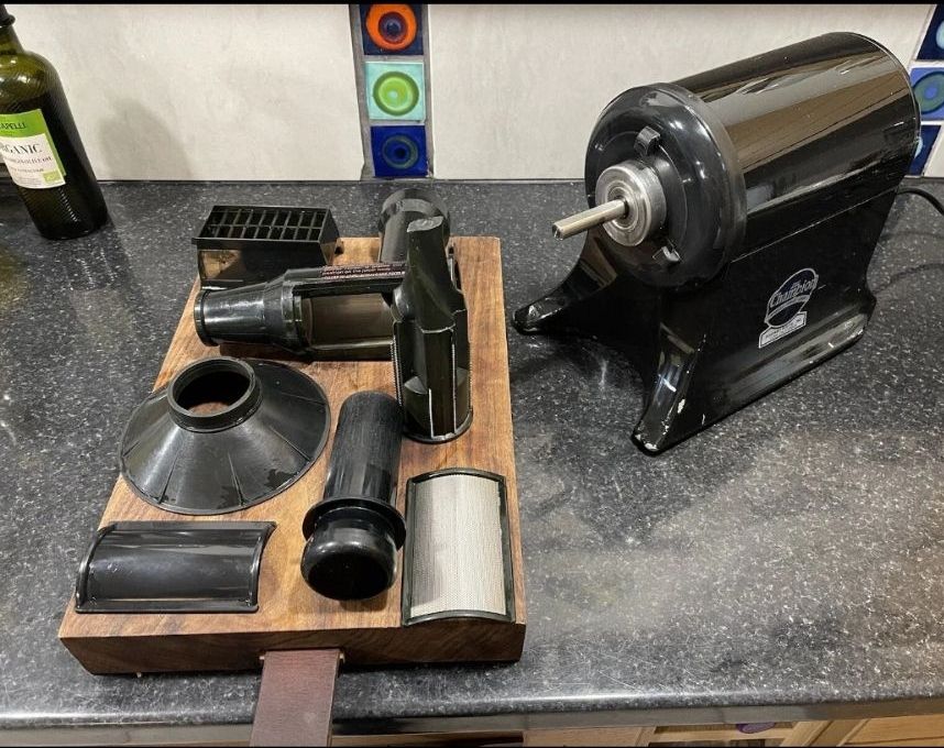 My impulsive eBay bidding has made more bulk for the kitchen. Lou bought a Champion juicer a couple of years ago, and I always look at it longingly when I’m round hers. Someone in Hebden Bridge was flogging one. Collection only. I made a modest bid and was surprised to win.