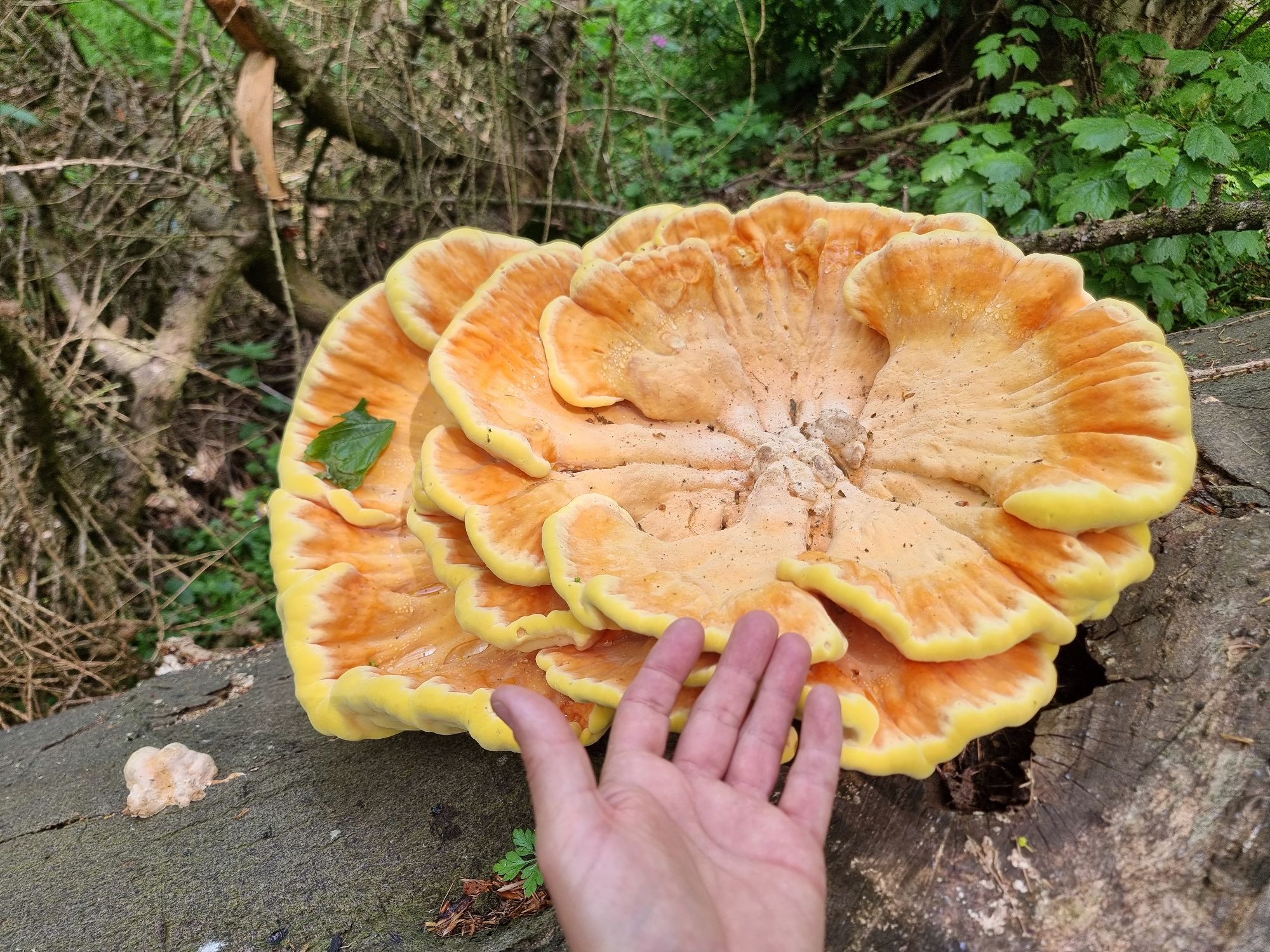 Roscoe was the name of the horse. A right old man. Fetlocks and piebald, he can’t be arsed to trot. “You’ll mostly be stopping him eating,” she said and that’s fair. But he took me right past the biggest goddamn chicken of the woods I’ve ever seen. “Fuck me!” I exclaimed, and the lass behind me said “Oh aye it’s beautiful up here.” I was making a mental note of where the hell I was so I could get right back as soon as the hack was over, and I did.