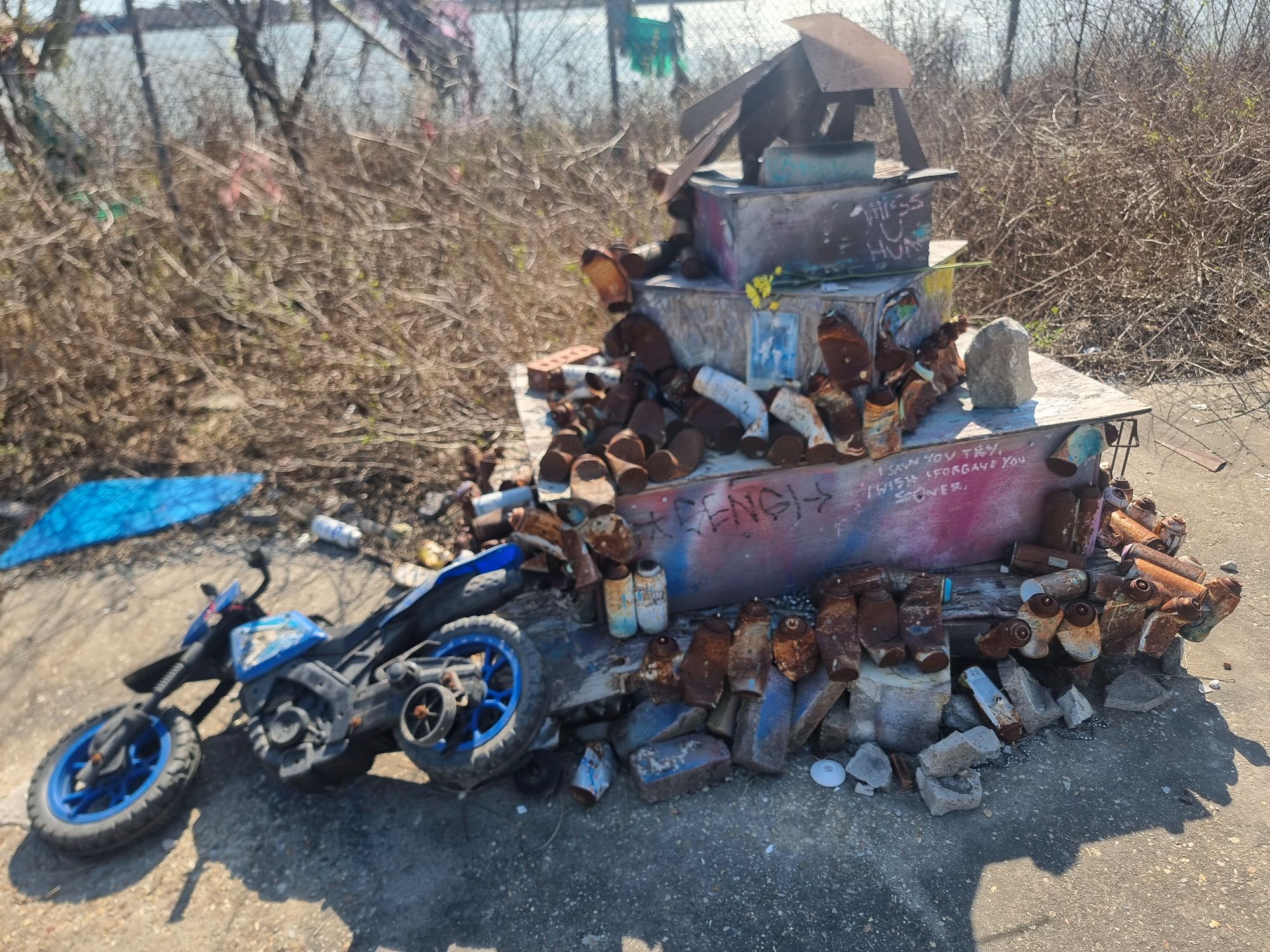 Mel took me to The End of the World, behind the squatted naval base in bywater. Wasteground and people have constructed shrines for loved ones taken too early. Ashes to the river but these memorials that stand for as long as we collectively wish them to stand.